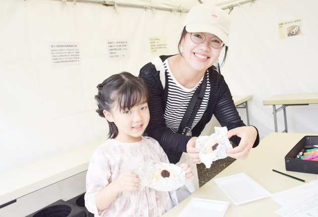 食育推進協議会の「合戦むすび作り」のコーナーでは、焼きみそと細ねぎ、ごま、かつおぶしなどを混ぜ、アルミホイルの上で焼いてむすびの具を作った。ミネアサヒの新米のご飯でむすびを作り、具を入れ、しょうゆをつけながらじっくり焼いて完成させた。市内大野田の美澤奈々未さん(7)は「難しくなかった」と話し、口に入れると「おいしい。あと2個作りたい」と笑顔だった。母親の藍さんは「家でも作りたい」と喜んでいた。