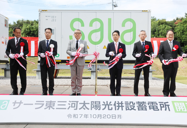 エネルギー事業を展開するサーラエナジー(豊橋市)は20日、東三河バイオマス発電所(同市)敷地内に整備してきた「サーラ東三河太陽光併設蓄電所」の開所式を行った。太陽光発電で充電した電力を夕方から夜間に放電し、電力市場で需給調整の役割を担う。