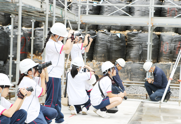 土木現場で撮影する写真部員ら(豊川市大木町で)