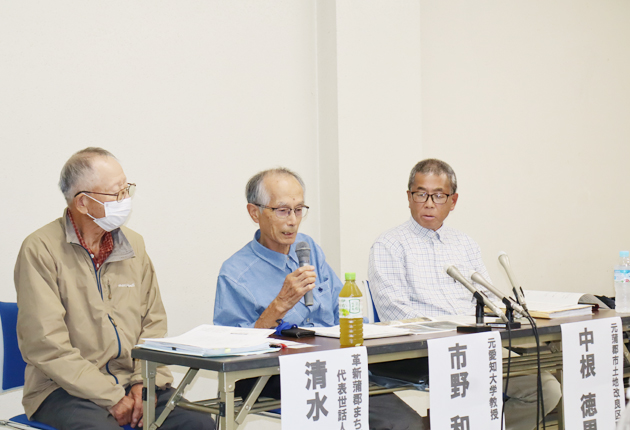 会見した「革新蒲郡まちづくり学校」は、県の報告書を独自に検証。元愛知大教授の市野和夫さん、市土地改良区の元職員・中根徳男さんらの調査を基に「周辺を通る豊川用水の漏水が主因ではないか」と指摘した。