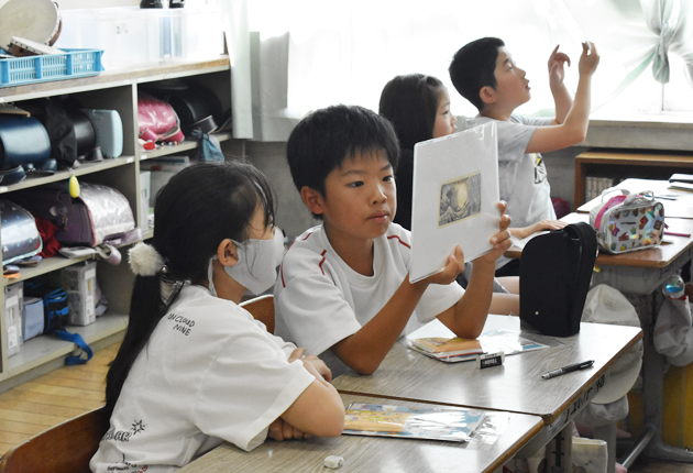 千円札に隠された偽造防止技術を見る児童ら(御油小学校で)