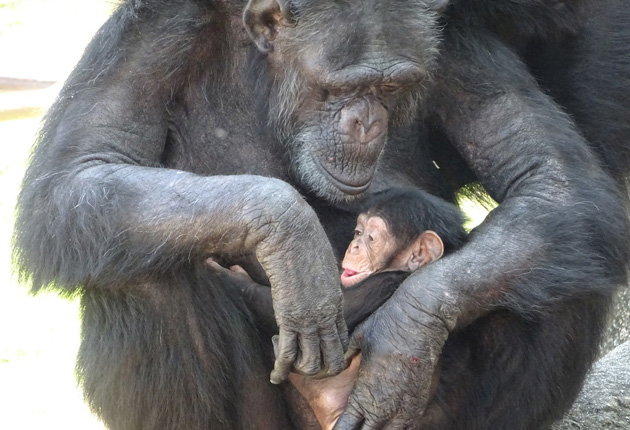 母親のマルタにしがみつくチンパンジーの赤ちゃん(豊橋市提供)