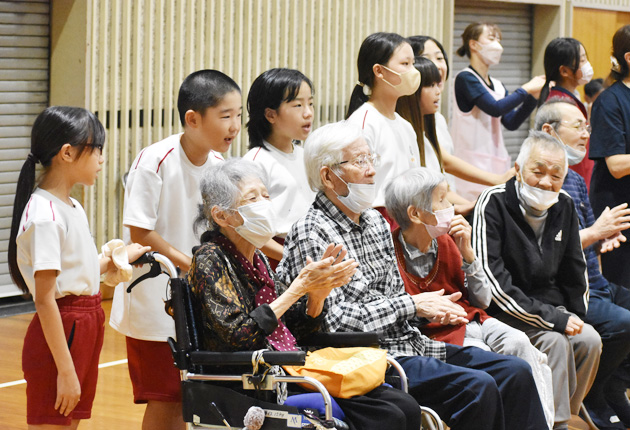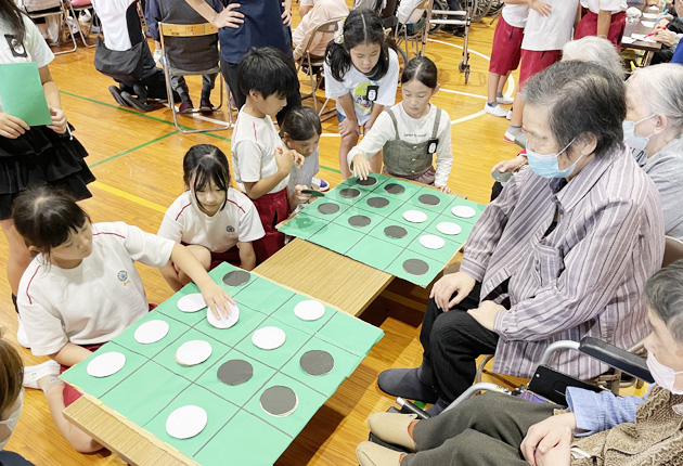 施設から入所者ら約50人と職員20人が来校し、子どもたちはリコーダーの演奏と歌を発表。デイサービスうららは職員らがクイズを出して楽しんだ。最後はグループごとに分かれ、子どもたちが考案して道具なども手作りで準備してきたオセロや紙飛行機飛ばし、ビンゴや神経衰弱などの遊びをお年寄りと一緒に満喫した。