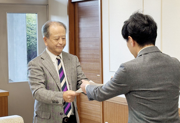 長坂市長(手前)に申し入れ書を手渡す藤田さん(豊橋市役所で)