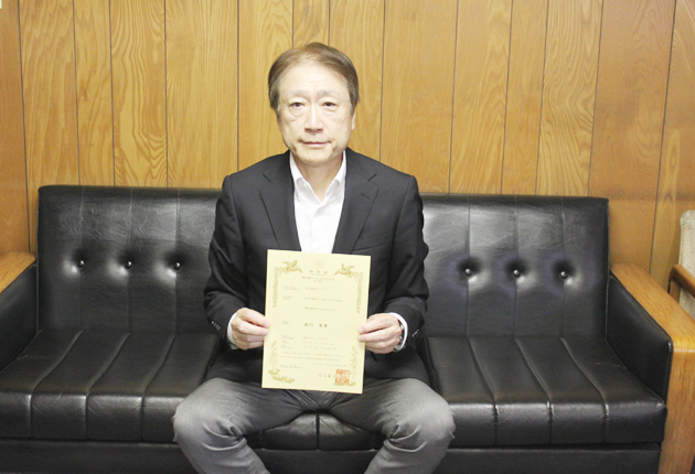 特許証を持つ西川社長(東海日日新聞社にて)