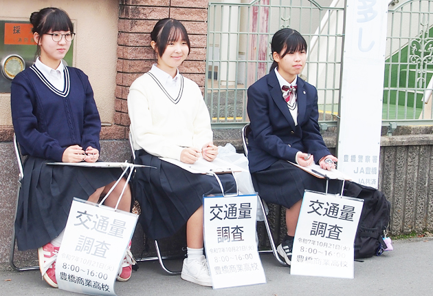 豊橋市向山町の県立豊橋商業高校は21日、高校前や豊橋駅周辺、岩田運動公園前など同市内28カ所で1年生による交通量調査を行った。 1年生240人は、午前8時から午後4時まで各調査場所に分かれ、歩行者や自転車、オートバイ、乗用車、トラック、バ...