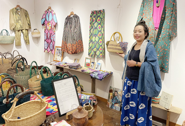 ガーナから仕入れた衣服やかごを紹介する松井さん(栄知村で)