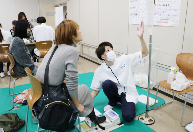保健医療学部理学療法学科の学生たちによる「体力測定」には、家族での参加が多くみられ、血圧・脈拍、体組成、骨密度、体圧分布、足趾(そくし)筋力を測定した。