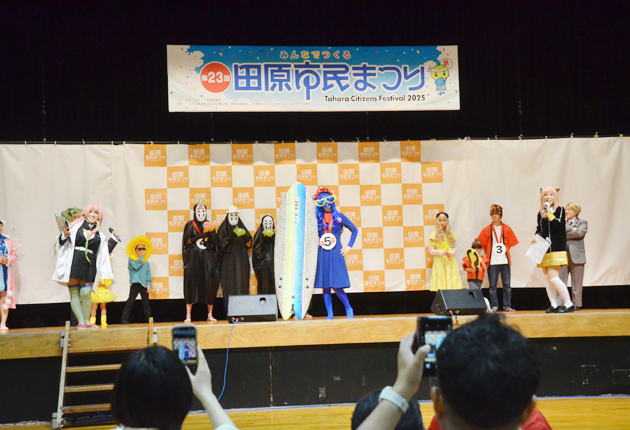 総合体育館では、初企画の田原をイメージした仮装のコンテストがあり、家族ら5組が参加。菜の花や菊、キャベツ、サーフィンなど田原の特産やイメージを仮装で表現し、拍手を浴びた。