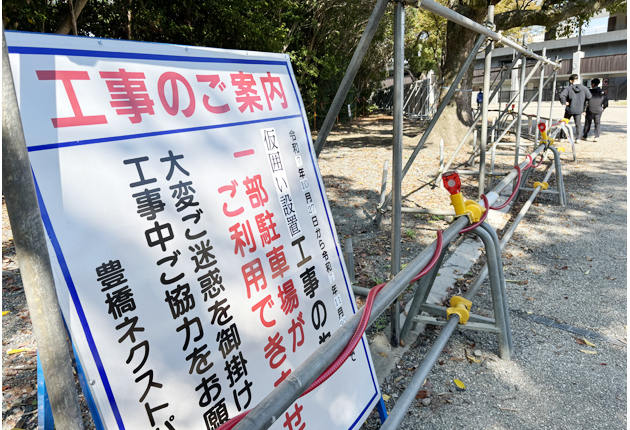フェンスの設置作業を知らせる看板(豊橋公園の旧豊橋球場で)