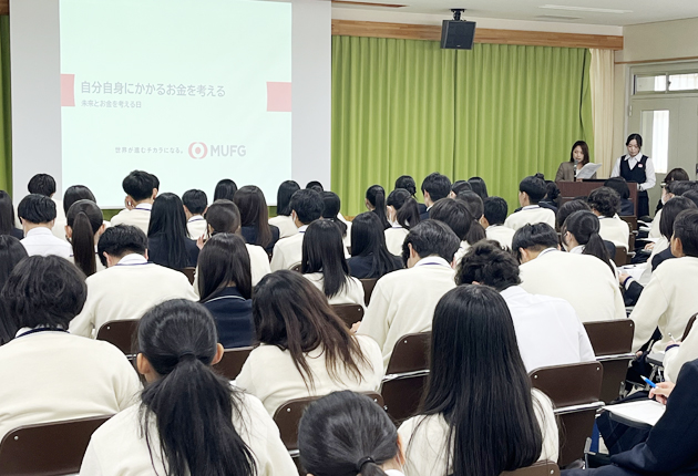 新城市西新町の三菱UFJ銀行新城支店(秋吉壮一支店長)は24日、新城有教館高校で初めて金融経済教育の出前授業を開き、専門系2年生117人が金融について学んだ。