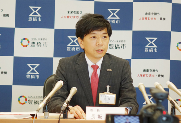 記者会見でアリーナに関する質問に答えた長坂市長(豊橋市役所で)