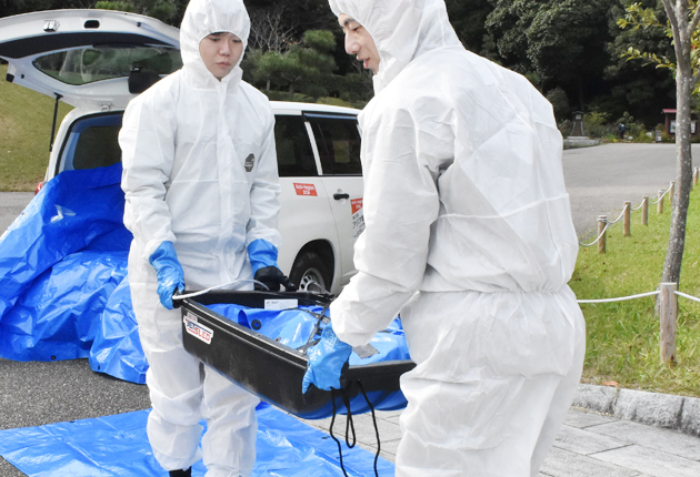 埋置では、園内の山中でイノシシの死体処理を実践。防護服を着て袖口や足首をテープで巻いた職員らが消毒作業を徹底しながら、死体を埋める穴を掘ったり、検体を採取したり、立ち入りを禁ずるテープで囲むなどした。