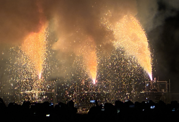 16人の揚げ手が一斉に火柱を噴出する「一斉揚げ」では、次々とハネる手筒花火のごう音に観客は大喜びし、盛んに拍手を送った。フィナーレには火薬量5斤(約4キロ)の大型の手筒花火が豪快に放揚された。