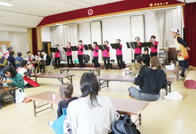 オカリナ演奏を聴きながら食事を楽しむ親子ら(伊奈集会所で)