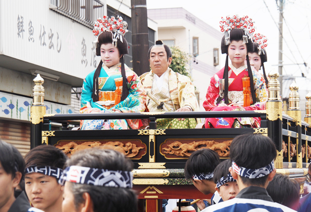 主役の吉田藩主松平伊豆守は、大三紙業取締役執行役員の山下洋さんが、次女雅姫は専門学校生彦坂のどかさん、三女琴姫は会社員都築真衣さんがそれぞれ務めた。松平伊豆守の輿(こし)には愛らしい小さなお姫様も同乗し、沿道の人に笑顔を向けていた。行列の花、雅姫と琴姫は徒歩で輿に続き、多くのカメラマンからレンズを向けられていた。