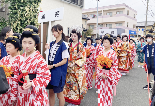 二川宿本陣まつりの名物・大名行列が2日、開催された。吉田藩主の松平伊豆守信明(のぶあきら)と娘の雅姫、琴姫、妹姫たちに扮(ふん)した市民を中心に、奴や腰元などが列を作って、豊橋市二川町の東海道を練り歩いた。途中、奴踊りや手踊りも披露された。地元の小中学生も参加し、行列を彩った。