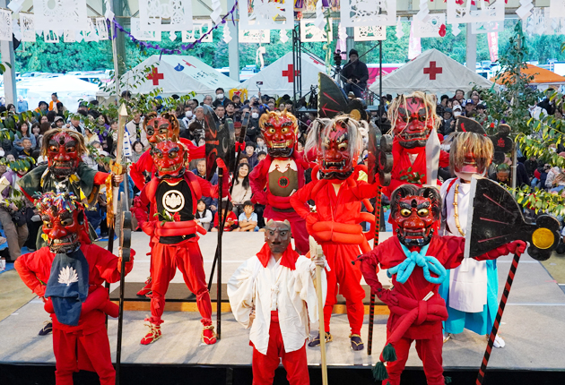 勇壮な舞で人々を魅了する奥三河の伝統芸能「花祭」が、今年も間もなく始まる。3日には東栄町本郷の東栄ドームで「東栄フェスティバル」があり、祭りの主役とも言える「榊鬼」が7年ぶりに町内10地区から勢ぞろいし、花祭ファンが詰めかけた会場を大いに沸かせた。