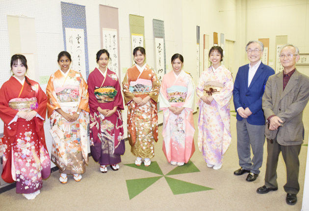 関係者が展示作品の前に立つ。右から、協会の金子副会長、天野会長、留学生ら(新城文化会館で)