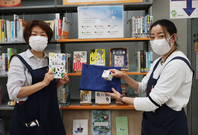 サイコロリーディングを勧める図書館職員(蒲郡市立図書館で)