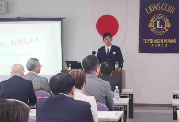 豊橋署は4日、豊橋市松葉町の豊橋市民センター・カリオンビルで「特殊詐欺に関する防犯講話」を開いた。橘英樹副署長が、豊橋南ライオンズクラブ(佐原光一会長)の会員約50人に多発する詐欺の手口を伝えた。 クラブの11月第一例会の中で講話を行った...