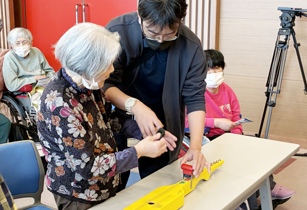 演奏に挑戦する参加者(あいトピアで)