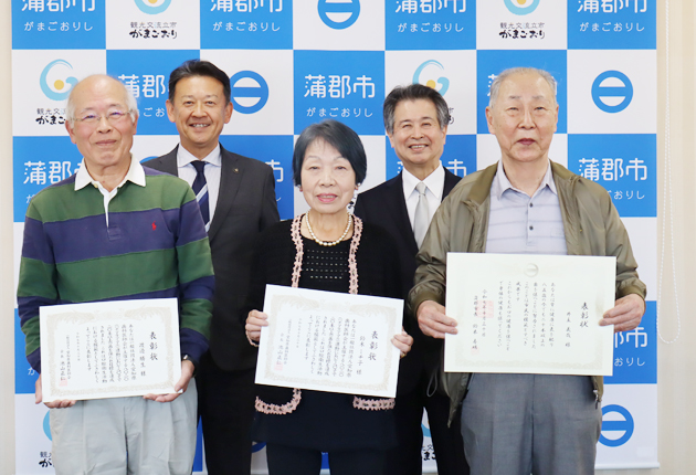 表彰された(前列左から)渡邉さん、鈴木さん、井立さん=蒲郡市役所で