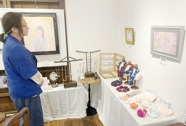 パステル画やアクセサリーが並ぶ企画展(栄知村で)