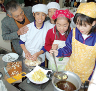 収穫した菜種油でサツマイモ料理を作る児童たち