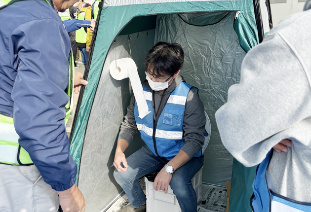 今回の総合防災訓練は、人命救助といった災害の初動対応に焦点を当てていたこれまでのやり方から大きく変更し、おおむね発災から72時間後の避難生活で重要とされる「TKB(トイレ、キッチン、ベッド)」を運用する同市初の内容で実施した。