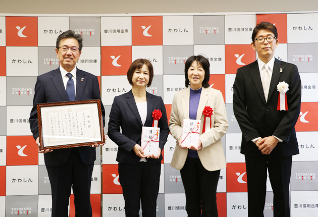 この日はオープン記念として地域の施設充実のための備品贈呈式があった。牛川支店管内にある市立牛川小学校にデジタルビデオカメラ一式、牛川保育園に大型砂場ワゴン一台が贈られ、真田光彦理事長が、浅岡泰恵教頭と冨田真由美園長にそれぞれ目録を手渡した。