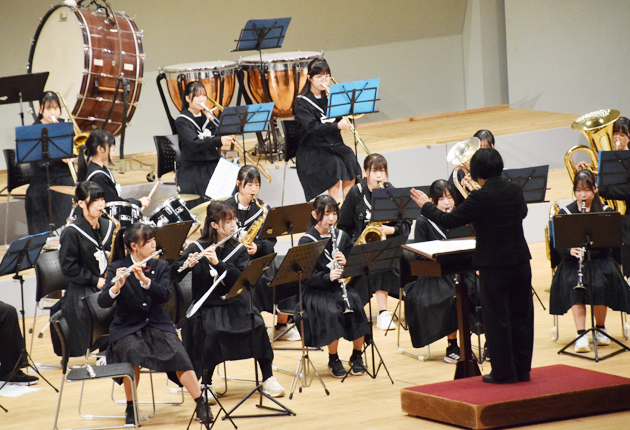 鳳来中学校吹奏楽部は、村田真弓さんの指揮で「怪獣の花唄」「Official髭男dismメドレー」を演奏した。フィナーレは合同合唱。出演した「合唱劇『カネト』をうたう合唱団」「コーラス赤い靴」「ハートフルコーラス」「しんしろ星の子合唱団」のメンバーらが、平野とも子さんの指揮で観客とともに「さくらの街から」を歌い、会場が一体になった。