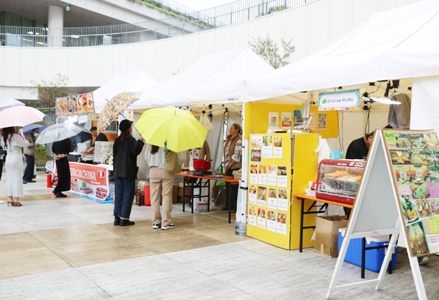 まちなか広場には、ブラジル、メキシコ、ベトナム、ペルー、ウクライナなどの料理を提供する屋台やキッチンカー、各国の民芸品などを紹介するバザー・フェアトレードのブースが並び、来場者を楽しませた。