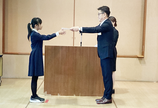 表彰状を受け取る寺田さん(豊橋市中央図書館で)