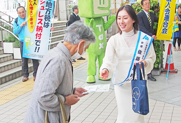 豊橋駅東口ペデストリアンデッキでは、佐藤さんとタレントの大城光さん(MAG!C☆PRINCE)、東三河法人会会員や豊橋税務署の職員ら25人が、税金のキャッシュレス納付などを呼び掛けるチラシとシャープペン、ポケットティッシュなど200部を配った。