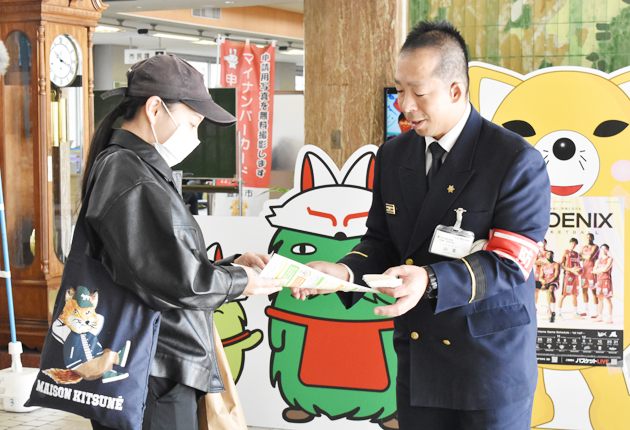 来庁者に啓発チラシを配布する消防職員㊨(豊川市役所で)