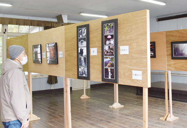 鳳来寺表参道周辺の写真作品が並ぶ会場(新城市門谷の旧門谷小学校で)