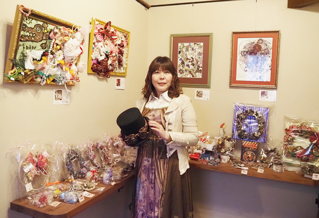 フラワーブティックリビーの伊藤なつこさんは、懐かしい服やバッグなどを使ったコラージュと押し花、プリザーブドフラワーのリースなどを出品した。姪が赤ちゃんの時に着ていたベビー服などを活用したコラージュはかわいらしく、目を引く。クリスマスのリースや正月の花飾りも販売する。