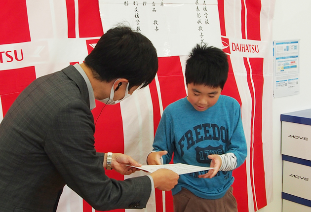 豊橋市向山町の愛知ダイハツ向山店(石川雅祥店長)は15日、同市立くすのき特別支援学校(野依町、杉山富美子校長)の児童の絵画を展示する「くすのき特別支援学校作品展」で、来店客の投票により選ばれた優秀作品の表彰式を開いた。 最高賞の「くすのき...