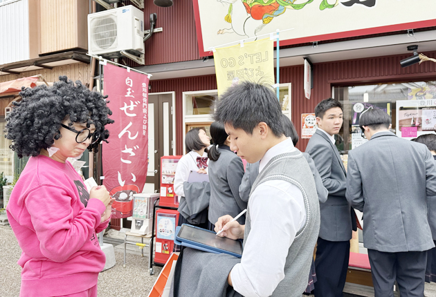 「よび田屋」の店主に熱心に質問する生徒(豊川市門前町で)