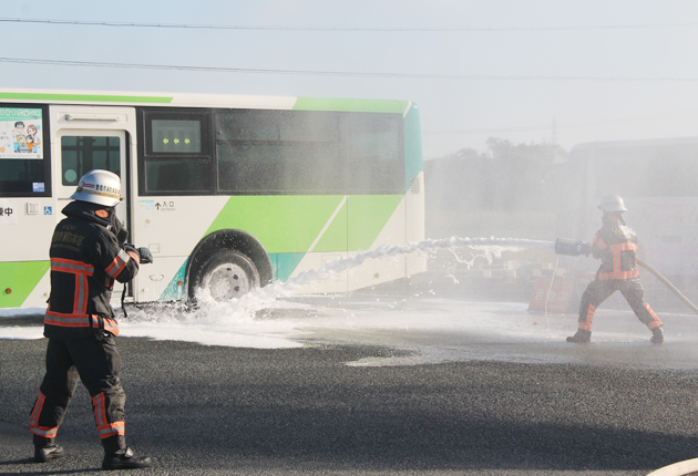 近年にバス関連の火災は起きていないが、今年に市内の国道バイパス上で大型トラックから出火する事案があった。訓練で隊員は、燃料への延焼を防ぐため泡消化剤を使った活動を実施した。