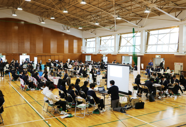 豊橋市の県立豊橋商業高校で17日、高校生のための地元企業情報「SOURCE SCHOOL」特別イベント「地元の企業を知ろう」が同校体育館で開かれた。東海日日新聞社が主催した。