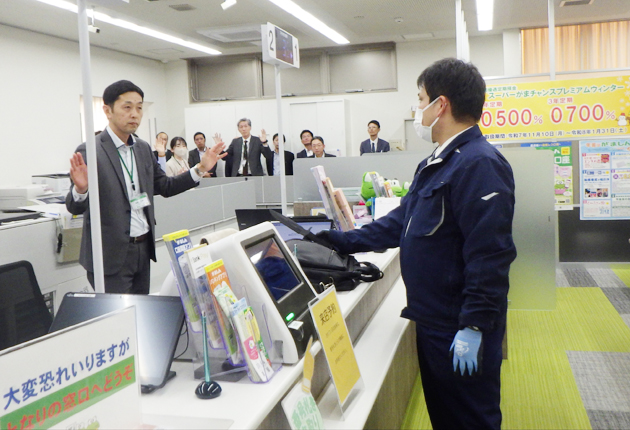 強盗対応訓練の参加者ら(豊橋市・蒲郡信用金庫前田南支店で)