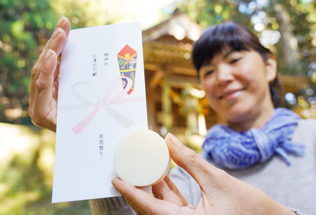 お清めせっけんを手にする福田さん(16日、槻神社で)