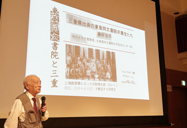 講演会は、愛大東亜同文書院大学記念センターが主催。01年に創設され終戦まで続いた書院の存在と実績を伝えるため、2006年から資料展示も含め全国で開いている。今年で20年目、23会場となった。テーマは「東亜同文書院と三重」で、元記念センター長でもある藤田名誉教授が「三重県出身の東亜同文書院の卒業生たち」と題し講演した。小林さんのほかに書院OBで活躍した三重出身者ら4人を紹介した。