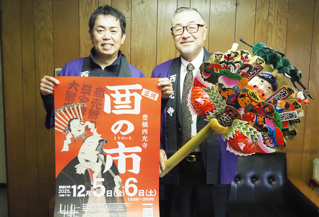 「福を呼ぶ」という熊手を買って来年の商売繁盛を祈る年末の風物詩「三河酉(とり)の市」が12月5、6の両日、豊橋市大手町の西光寺で開催される。酉の市奉賛会が主催し、三河酉の市保存会が協力する。奉賛会の戸倉信一郎会長と保存会の水野和也会長らが東日新聞社を訪れ、pRした。