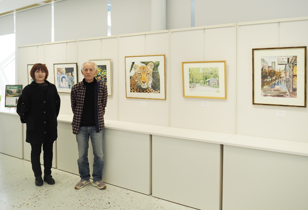 展示された作品の前に立つ提髪さん㊨と近藤さん(OKBギャラリーで)