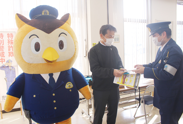 署員らは、県警のマスコット「コノハけいぶ」と詐欺の手口を記したチラシを配布。海外から自宅の固定電話に入る着信を拒否する手続きも受け付け、被害抑止を図った。