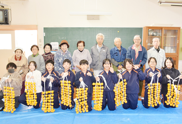 新城市立鳳来寺小学校の6年生9人が19日、同市布里の旧鳳来西小学校で地元老人クラブ錦生会(筒井博仁会長)のお年寄り9人と干し柿作りを行った。 この日、用意されたのは近くで採れた渋柿550個。児童らはお年寄りの指導を受けながら、 ナイフを使...