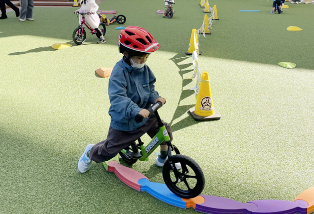 ストライダーで障害物のあるコースを試走する子どもたち(イオンモール豊川で)